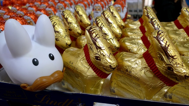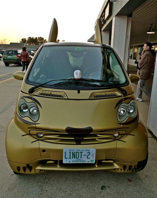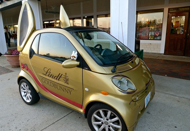Pipkin happened to be in the neighbourhood of a Lindt chocolate shop when he came across this Smart car painted gold and detailed with labbit ears and bunny face, sitting outside the shop!