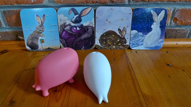 During their long swim north, the munko whales snuck into a cozy home in East Barnard, Vermont, where they found these whimsical labbit paintings. Each one depicts a labbit in a different season, from spring to winter. Noticeably missing was Vermont's fifth season - mud season. The whales thought Pipkin and the other labbits would appreciate this photo.