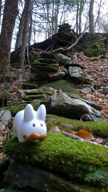 Pipkin hops along an old stone wall on the way to Prospect Hill in Dummerston, Vermont. He's surprised that these rolling hills, now covered with mature birch and pine trees, were once pastures. Only the surest of sure footed labbits should hop along moss covered stone walls. It can be very slippery!