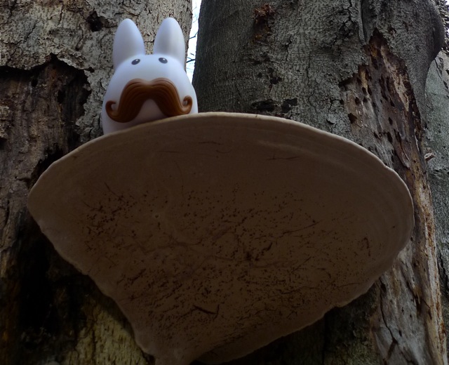 ...but personally, he thinks it makes him look big. (But maybe not big enough to climb up to the next shelf mushroom above him.)