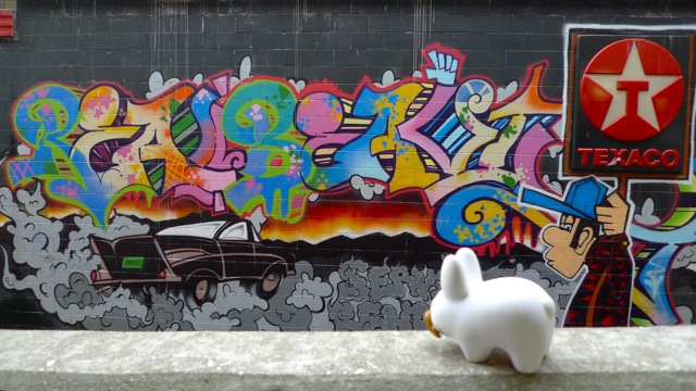 Pipkin likes this wall art a lot better than yesterday's anarchy symbol under the I-91 overpass on Rte 121. Can you help Pipkin figure out what it says? He doesn't quite get it, but he does like the colours.