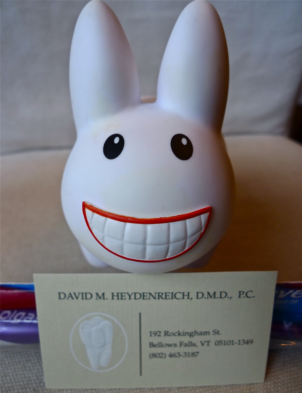 If you're looking for a dentist in Bellows Falls, Pipkin recommends Dr. David Heydenreich. You can see his contact information in the business card above. Keep brushing and flossing! Unlike labbits, you've got the only chompers you'll ever have!