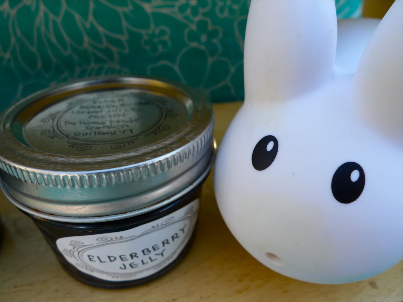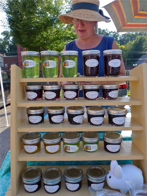 Pipkin picks up a jar of Elderberry Jelly at the Bellows Falls Farmer's Market. The friendly lady of Te Home Made Garden in Guilford Vermont, makes wonderful jams and jellies. She had a new flavor - basil jelly - which tasted great on a cracker with cream cheese. Pipkin likes berries though, so he decided to go with the Elderberry Jelly today.