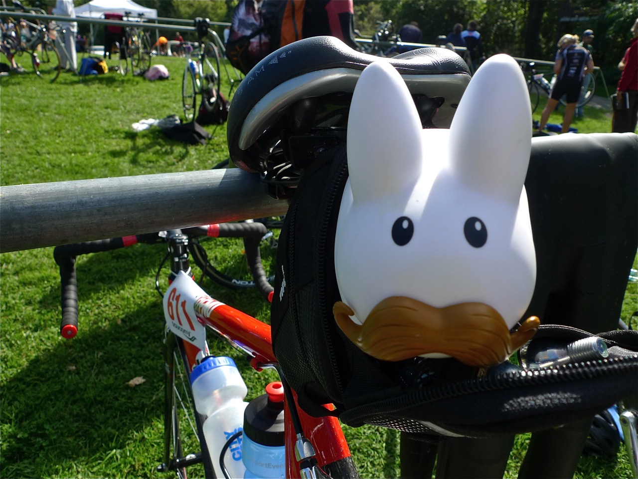 Pipkin hitched a ride on this competitor's bicycle at an olympic distance triathlon in Burlington, VT. While racer 611 was out on her 1 mile swim, Pipkin zipped himself into her underseat bag.