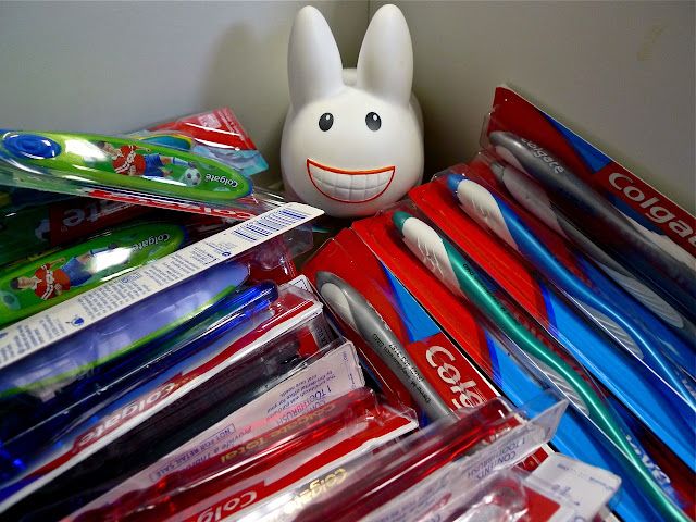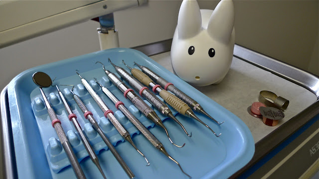 These home dwelling labbits do eat a lot of sugar laden baked goods, so for them, tooth brushing is a necessity. Once in a while, it's best to get a professional cleaning and check up. So, today Pipkin visited a dentist in town.