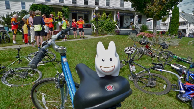 The route was shaped like a bunny! That was definitely the right ride. She hopped into an underseat bag and zipped herself in so she could peek out the back. What fun! And after the ride, she joined the riders on the green in Putney to enjoy lemon iced tea, cranberry scones and berry muffins from Front Porch Cafe. This won't be the last time she joins in on some two wheeled fun. Big thanks to the West Hill Shop in Putney for organizing the community ride, and thanks also to the Front Porch Cafe, for feeding a bunch of sweaty bikers on the green.