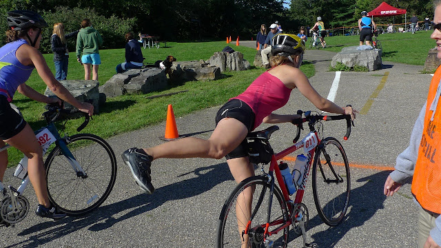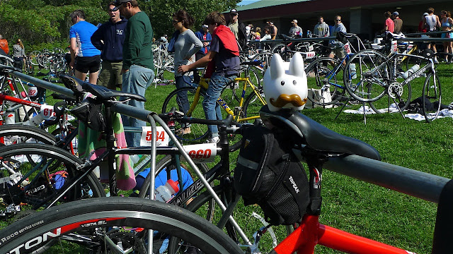 While 611 was off on her 6.2 mile run, Pipkin sunned himself with the rest of the bikes in the transition station. Then he hopped out to the finish line to cheer her on. She never knew he was in her bag the whole bike ride! She did really well, coming in 2 hours, 46 minutes and 18 seconds. Way to go 611! Way to hustle!
