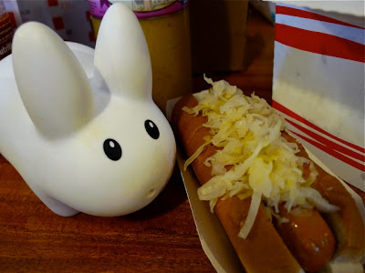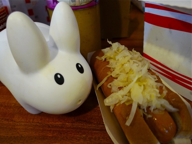 | Mmmmm tofudog with sauerkraut and mustard. |