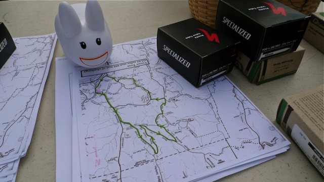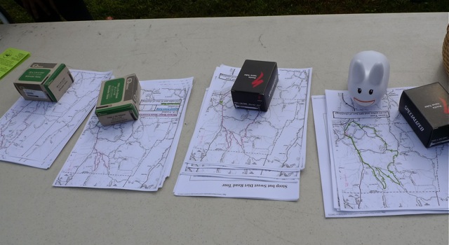 Pipkin's been known to hitch rides on motorcycles and bicycles, so Clover followed his lead and found a friendly group of riders to ride with. She lucked out with a Sunday morning community ride in Putney, Vermont. There were four different rides offered, all on the lovely dirt backroads of Putney. Clover took a look at the maps to see which one she wanted. Something long, but not too fast!