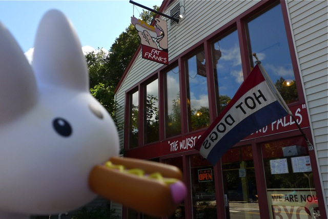 Pipkin likes to go to The Wurst Place in Bellows Falls...Fat Franks! Located an easy hop downtown, Pipkin will often order either the tofu dogs with sauerkraut, or the veggie burgers. There are lots of options for meat eaters too. The double fried french fries are also a naughty treat, but Pipkin tries not to indulge too often.