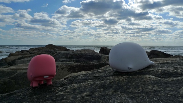 He had a chat with the two whales (the white is a munko whale, and the pink one a munkosaur) and discovered they are on a trek to visit their whale brethren in northern Vermont. They have been land swimming a long way!