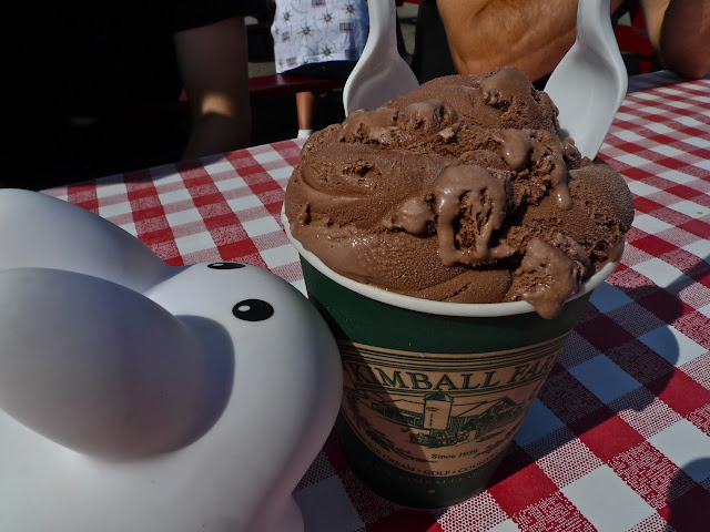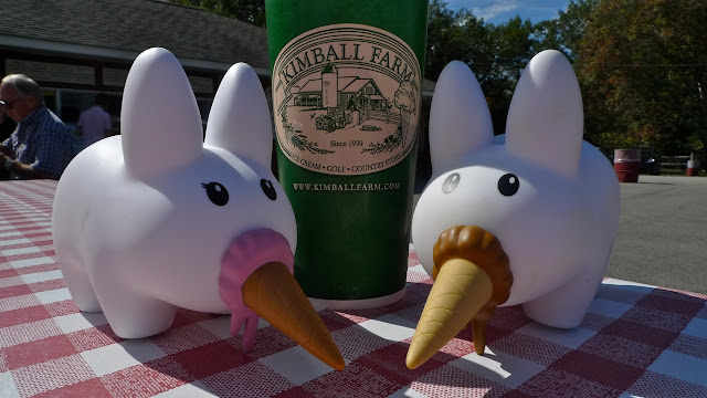 Summer is over and we're well into autumn, but the leaves are still pretty green in the Green Mountain state. The sun is shining bright and you might be fooled into thinking it's still summer when the leaves haven't changed to a brilliant gold, red or orange. The temperatures this weekend are even into the mid to high 70s (around 23 Celcius, my non-American friends). So when the sun shines bright like this, the labbits naturally think of one thing: ice cream. And where better to enjoy it than at Kimball Farm, with a grilled cheese sammy and a side of waffle fries and a slice of watermelon? Yum.