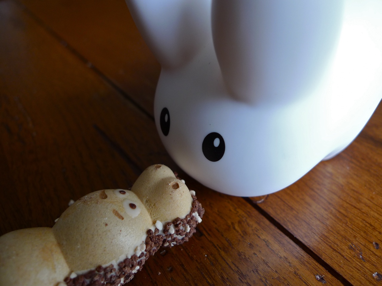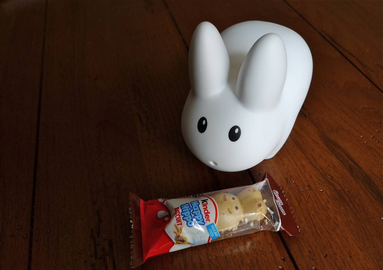 Labbits wouldn't eat real hippos, and they do have a sweet tooth for cocoa. This Kinder Happy Hippo is a crisp and crunchy wafer with smooth hazelnut cream layered with milk and cocoa cream. Even though Pipkin felt a little guilty biting into the hippo's cute face, he has to admit it was a very tasty treat.
