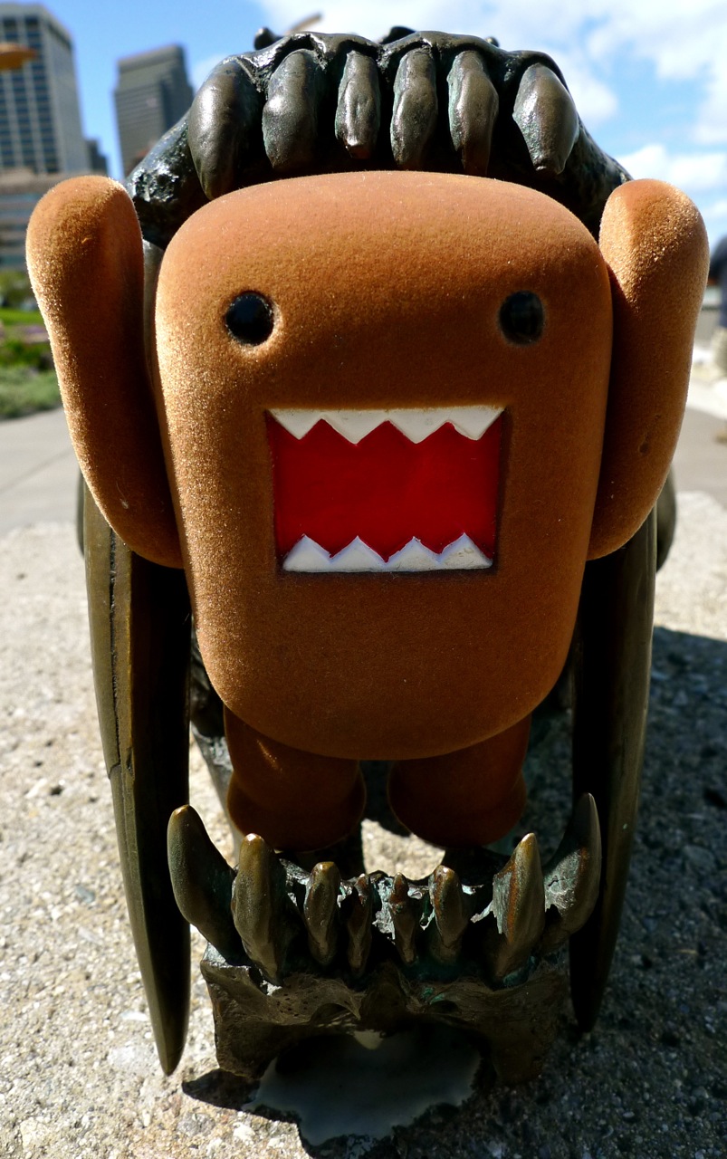 Domo looks to be trapped in the jaws of a smilodon fossil (sabre-tooth cat). He wonders if maybe he is a descendant of such a wonderful creature, alas, the teeth may be the only resemblance.