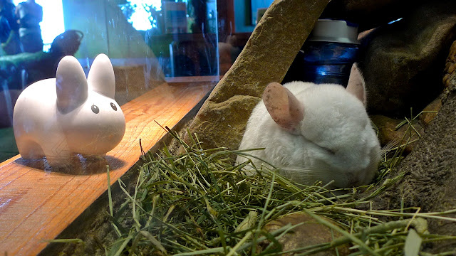 But it's not all the life aquatic along the piers of the Embarcadero. There were a variety of land animals at the Aquarium of the Bay, like this white chinchilla. Pipkin really wanted to have him freed of box life in the Aquarium (where he had no other chinchilla friends to hang out with) but he couldn't get him out of the glass cage. He hopes the chinchilla doesn't have too bad of a life there. At least he's got lots of food, and he does look like he's got a cozy set up.