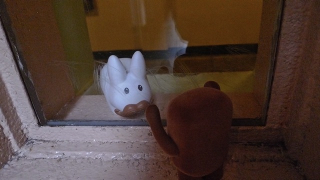 Domo's actually small enough to fit through the bars, but Pipkin's just a touch too fat and bunchy to fit through. No escape for labbit! (Unless he drops a little weight.)