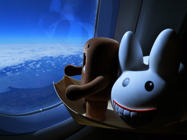 As the plane passed over a large body of water, Domo broke out the emergency rescue boat and they pretended they were prepping for a crash landing. It was fun to pretend, but the passengers around them gave them weird looks. Whatever. Don't hate just 'cause we're having fun!
