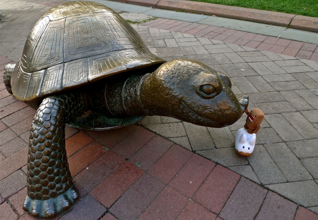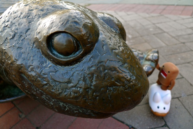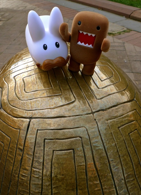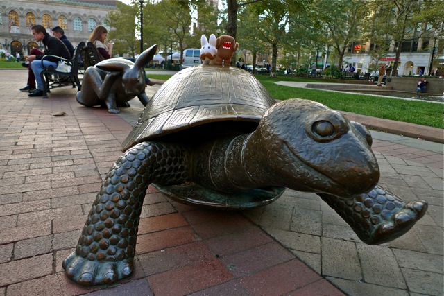 Domo and Pip climbed on top of his shiny, bronzed shell and enjoyed a tour of Copley Square.