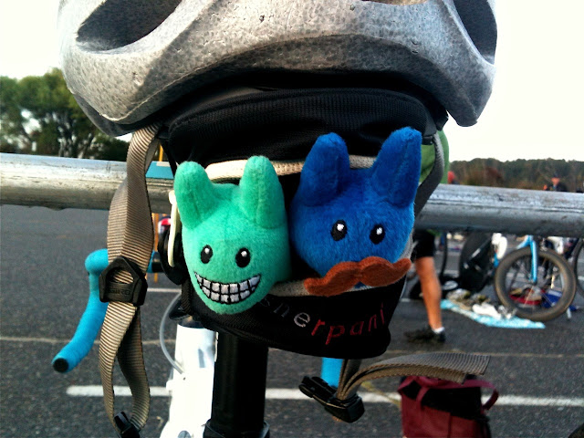More cyclists whizzed by. And more. Too many! The course wound its way away from the ocean, away from the crowds and onto quiet town roads. Masher hit a bump and a clanking sound of something hitting the ground woke him out of his ocean dreaming. He pawes around his bike. Everything seemed in place, nothing loose. What was that sound? Water bottle, cage, check. He was still moving forward. The bike felt fine. He switched gears, spinning easier, slowing down. He felt behind him. The saddlebag! It hadn't been zipped up! When he and Doddy were taking photos he got distracted and didn't zip it up. Masher pulled over to the right and dismounted. He gave his bike a quick once-over to make sure nothing else was wrong, then zipped up his bag. His tire levers had fallen out and must have broken apart when they crashed to the ground. Jumping back on the bike, he spun up quickly with renewed energy. Back on course, he decided there would be no more getting passed. He pushed into bigger gears and got moving. He passed cyclist after cyclist, and eventually found himself enjoying the ride.