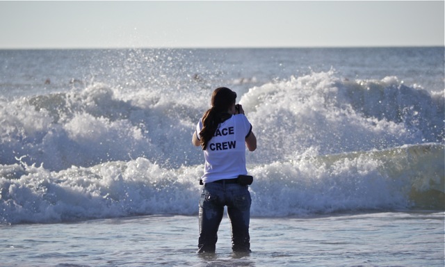 | Now that's a dedicated volunteer! Stephanie takes photos at the swim start. |