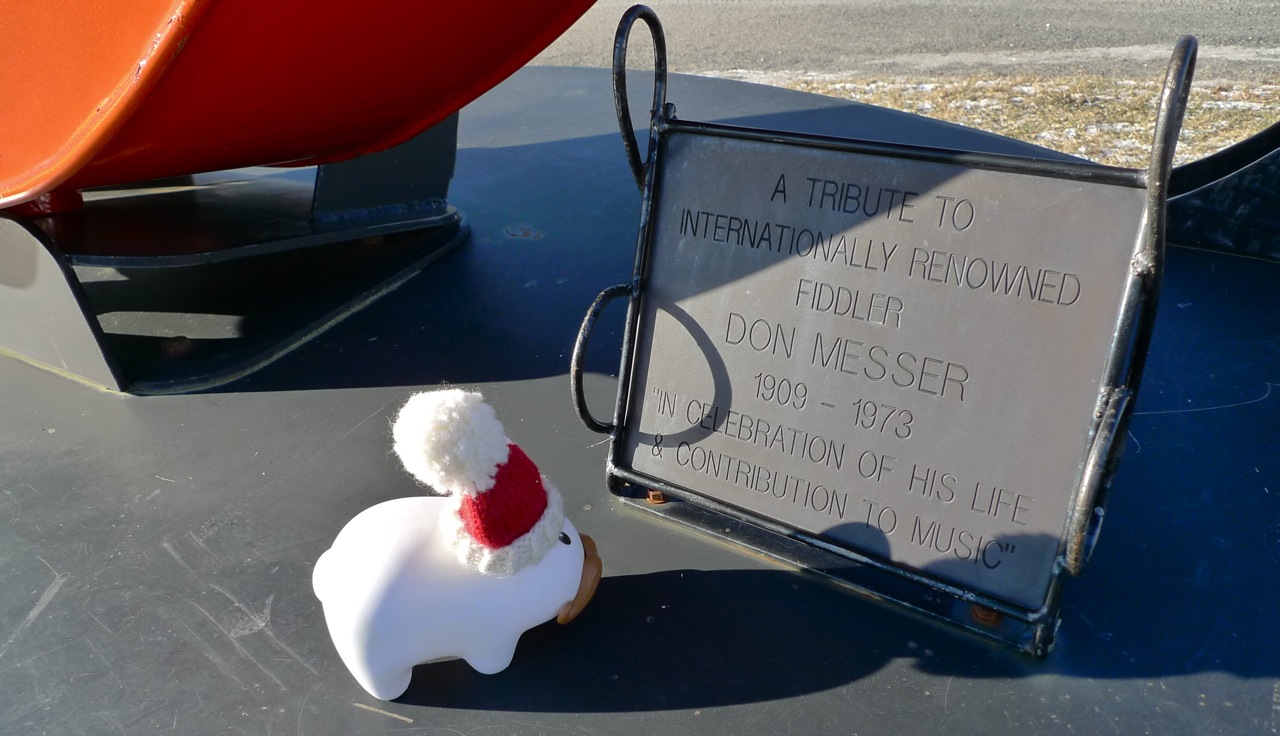 The giant fiddle was created in 2000 by Harvey craftsman Roland McLean, to honour Canadian fiddler Don Messer, also from Harvey. In the picture below, Pipkin climbed up on the chinrest to show you just how big (about 14 feet) the fiddle is!