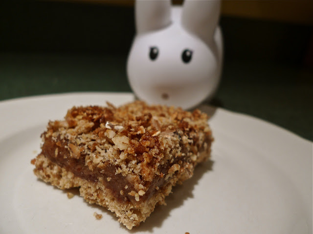 Spread the dates evenly over the oatmeal crust. Sprinkle the remaining dough evenly over the top of the dates. Bake for about 30 - 40 minutes or until golden brown. Place on a wire rack to cool. Once the squares have cooled, cover the pan with plastic wrap, and place in the refrigerator at least one hour or until firm enough to cut easily into squares.