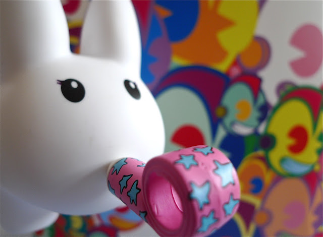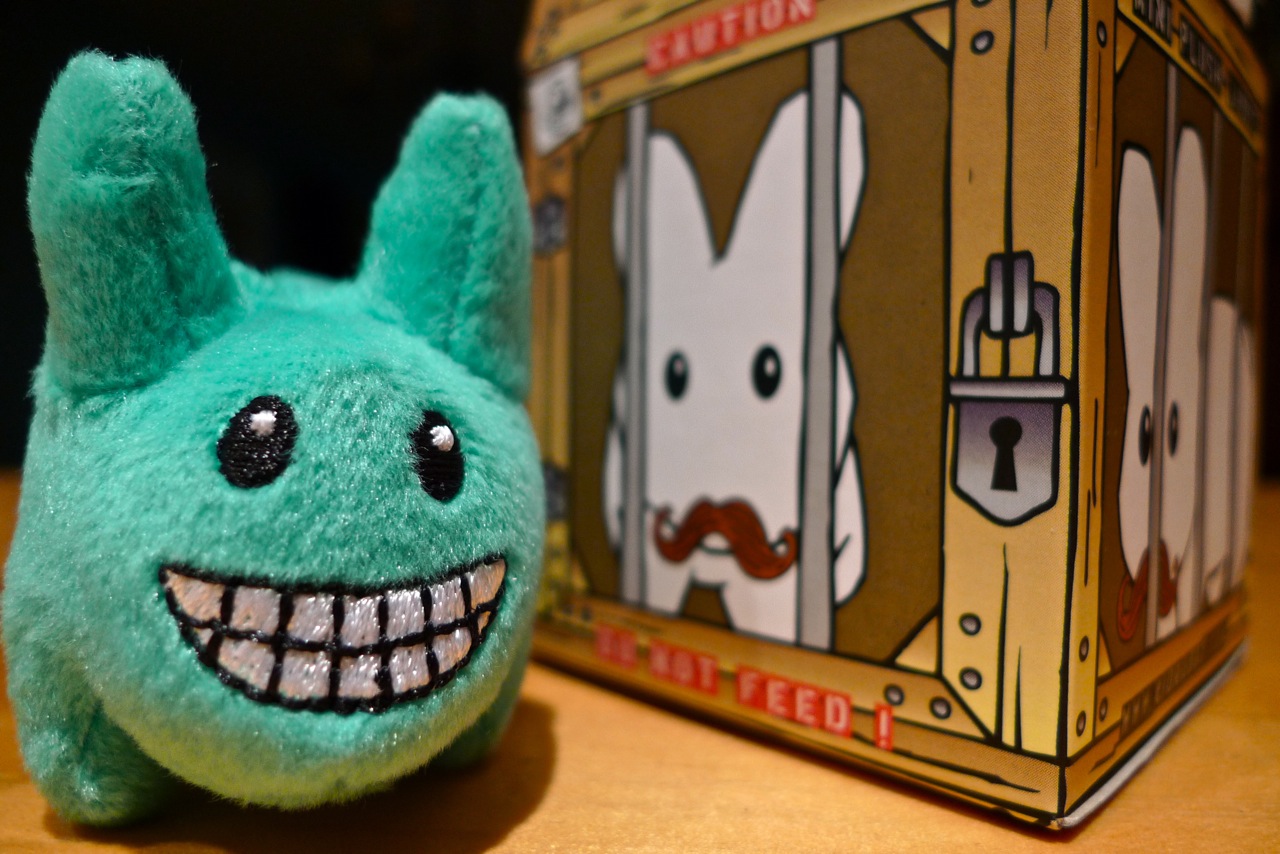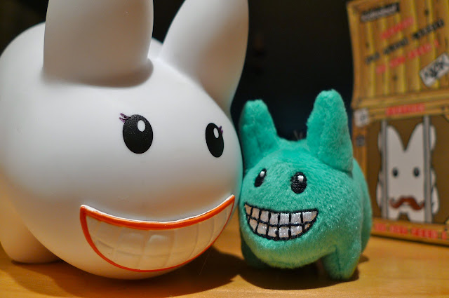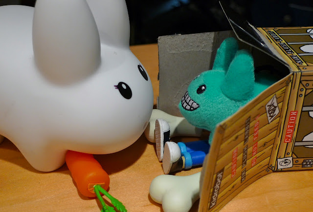 ...a pile of bones and sneakered feet came tumbling out of the crate. And climbing over them came this furry green labbit! Apparently feeding him turns him from a cute, fluffy white labbit into this green, mischievous grinning labbit.
