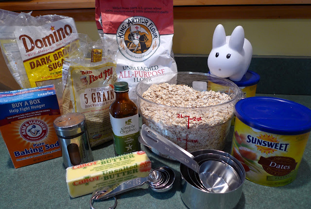 Mmmmm, date squares! Vanilla-y creamy dates sandwiched in an oatmeal multi grain crust. Yum. This makes about two dozen date square, perfect for bringing to a party or sell at a bake sale. Print and share the recipe here.