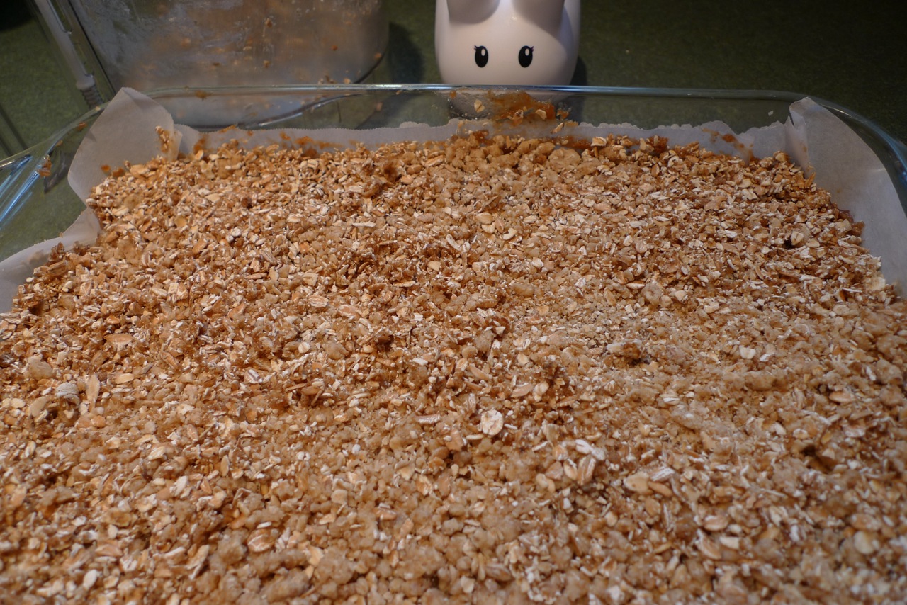 In the bowl of your food processor, place the oats, flour, sugar, baking soda, salt and ground cinnamon. Pulse to combine. Then add the butter and pulse until the mixture is crumbly. Press 2/3 of the mixture into the base of the prepared pan.