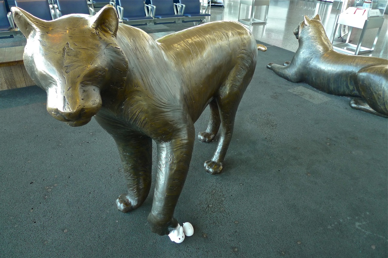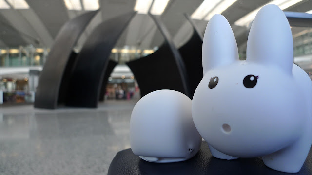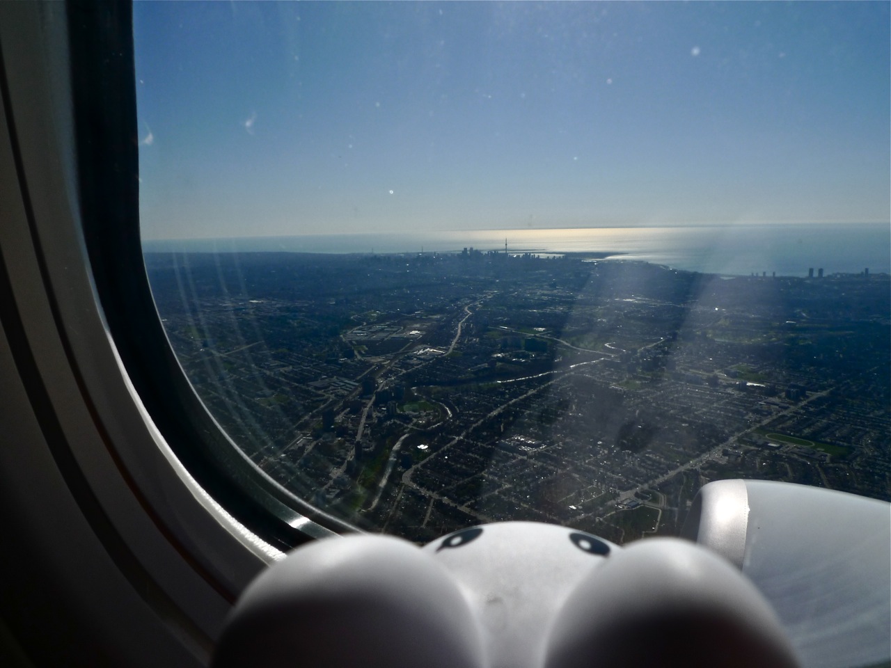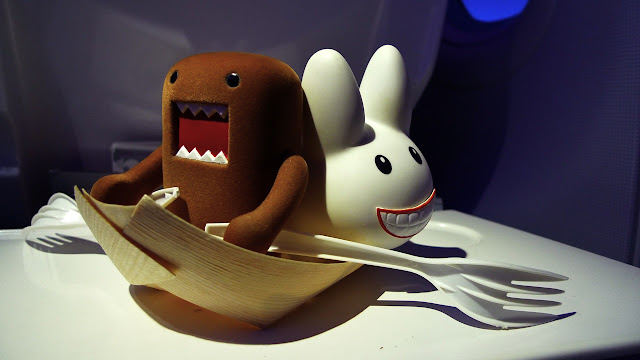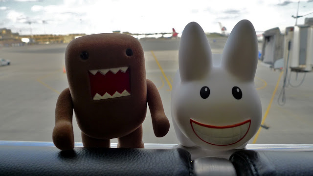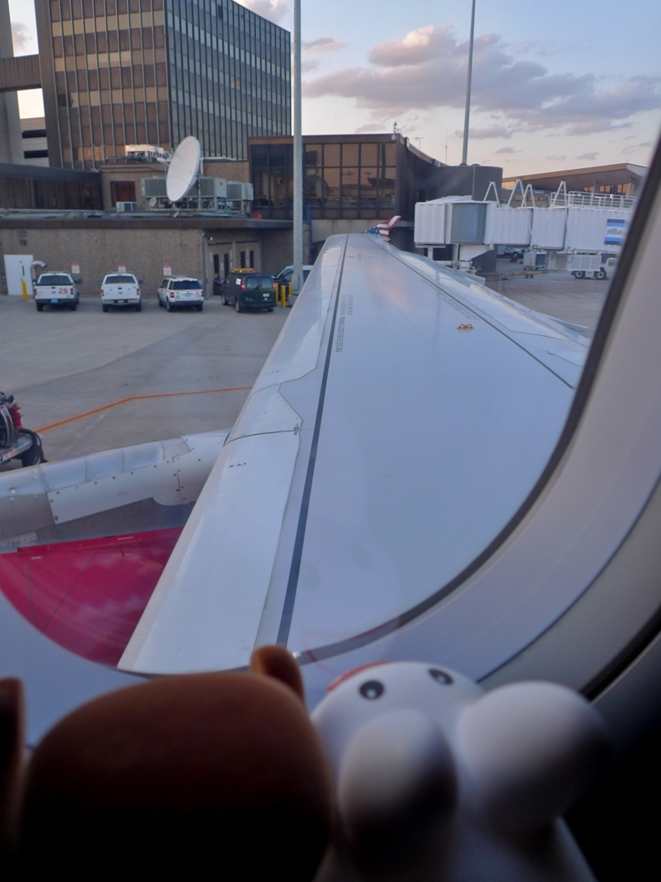 There weren't too many people on the flight. Almost everyone could spread out and take up a section of 3 seats to themselves, so Pipkin and Domo scored their favorite seats - window, over the wing.