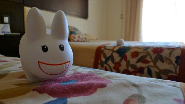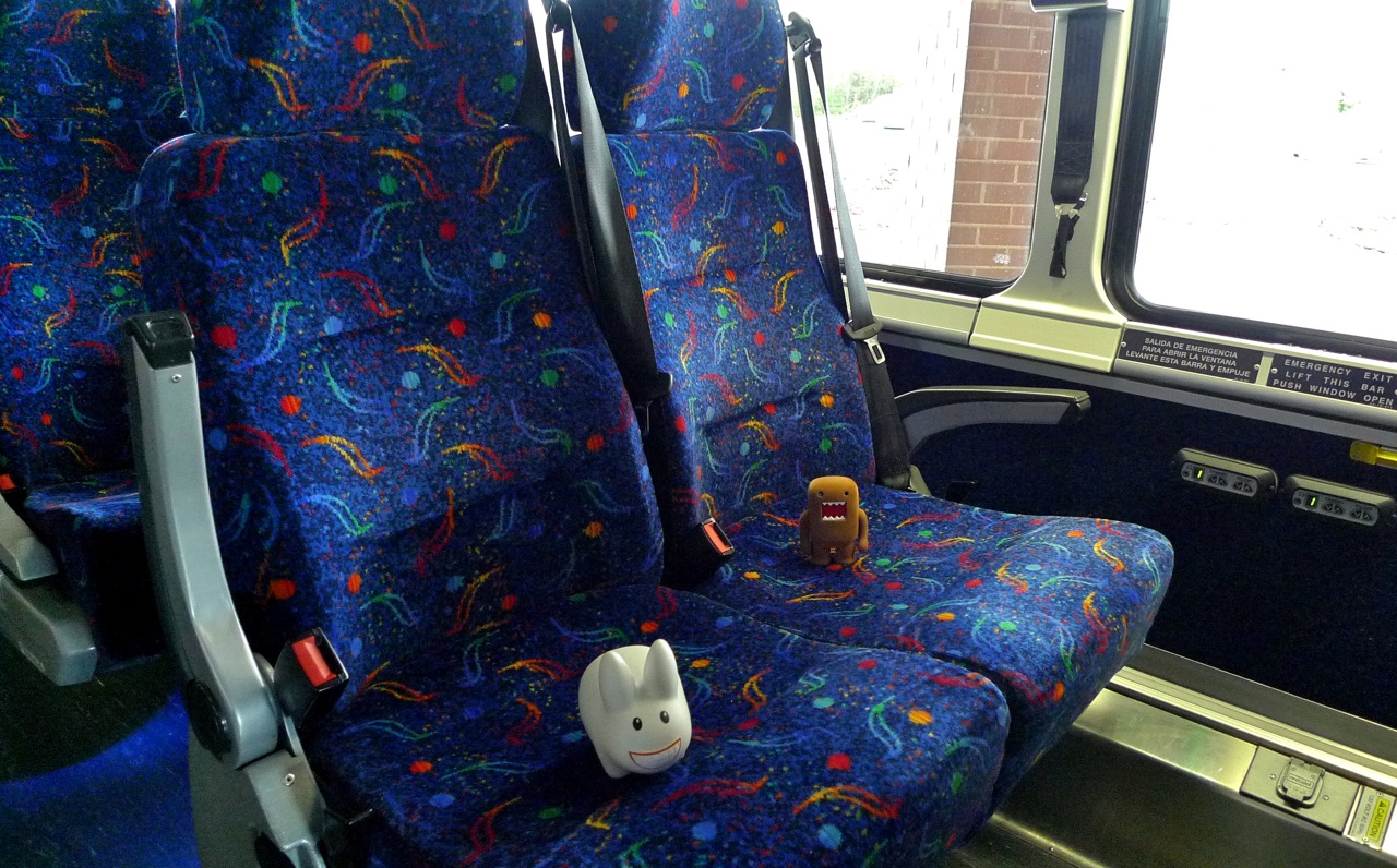 To get to San Francisco, Domo had to arrange hitching a ride to Londonderry, NH, where they caught this giant coach bus to Logan Airport. Pipkin thought the fabric was the most fun fabric EVER. It was like fuzzy rainbow confetti everywhere! Let the party begin!