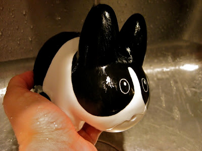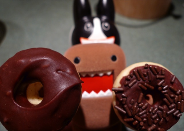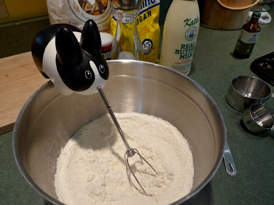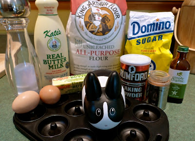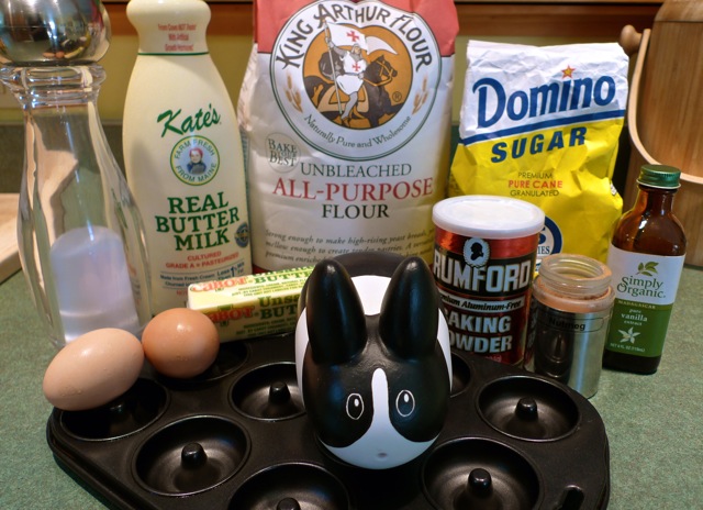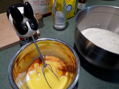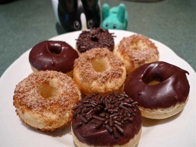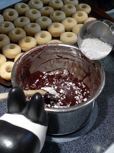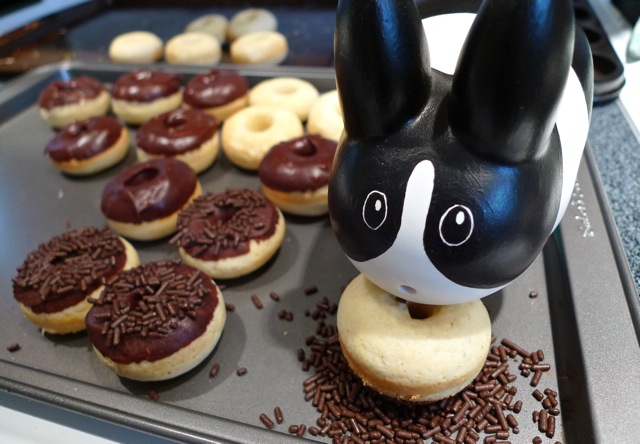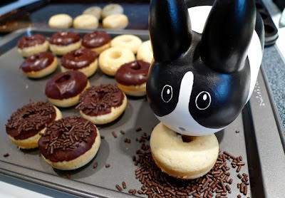 Ted made three kinds today: chocolate glazed, (Dutch labbits have a thing for things two-toned), chocolate glazed with chocolate sprinkles, and good old fashioned cinnamon sugar. These are also tasty plain, if you're into plain donuts. Since they're mini sized, you could float one in your coffee mug! Print the recipe