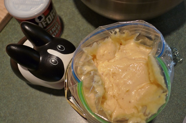 If you have a pastry piping bag thing, pour the batter in - it makes it easier to pipe the batter into the mini donut pan. Ted doesn't have a fancy pastry piping bag thing (probably because he doesn't know what they're called) but a quart sized ziploc bag works in a pinch. Pour the batter in (it'll fit!), zip closed, then snip a small corner off the bottom of the bag. Voila! DIY pastry piping bag thing.