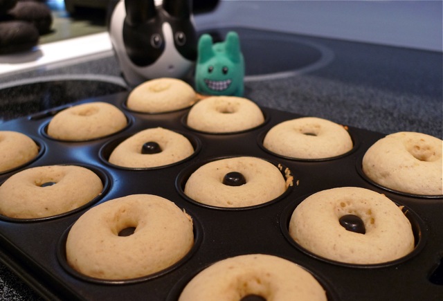 Pop in the oven for 7ish minutes (oven temps vary, so yours may take more or less time), or until the donuts spring back when pressed gently with a paw.
