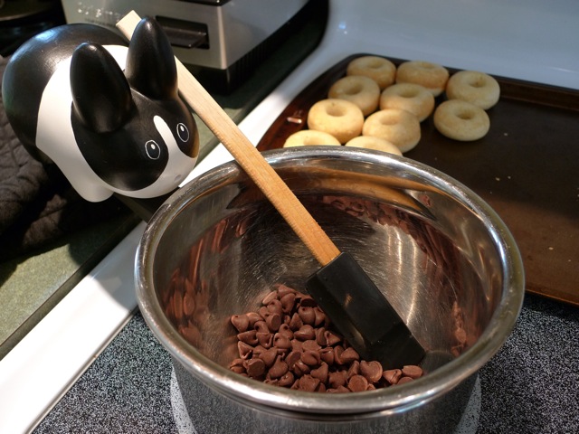 For chocolate glaze, set a bowl inside a pot with an inch of water and turn the heat to low. Add the chocolate chips, and stir continuously as the chips melt.