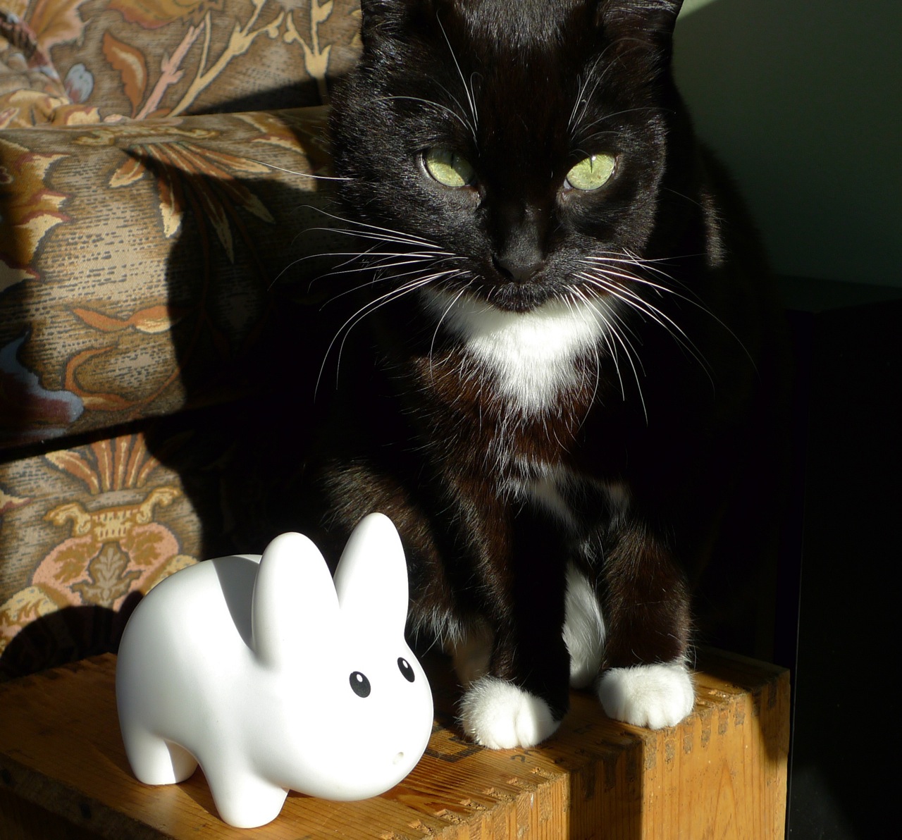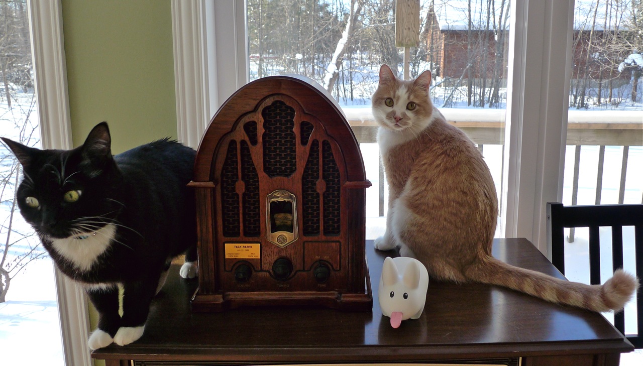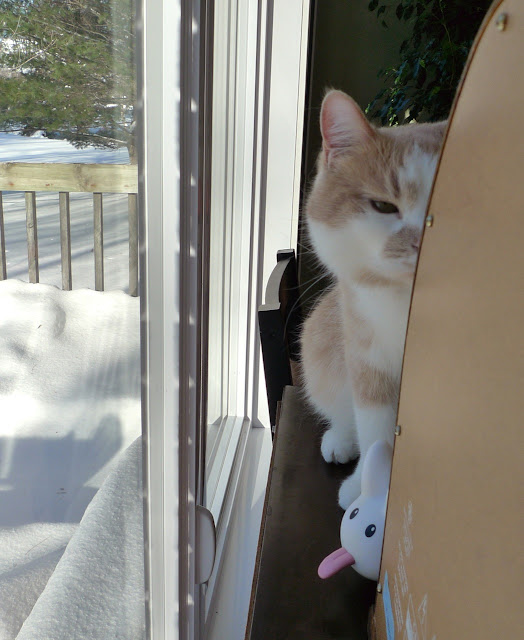 Pipkin is visiting his friends Fry (ginger cat) and Majel (Tuxedo cat) in Ottawa, Canada. They're spending time sunning together in the sunroom.