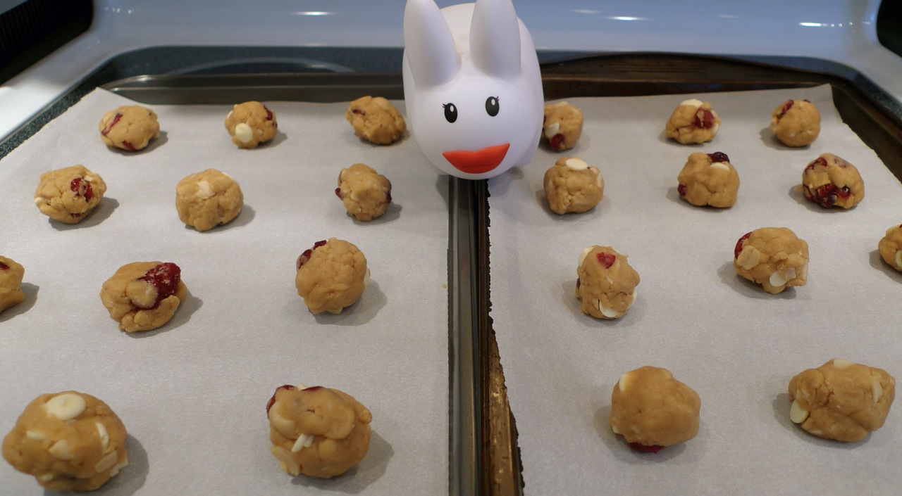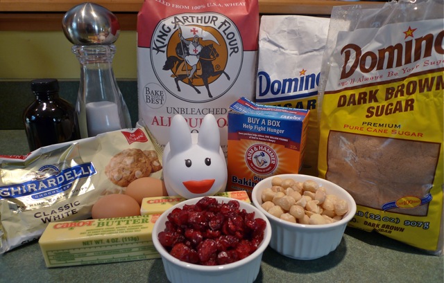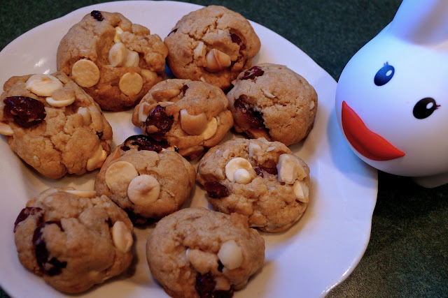*The original recipe called for 3/4 cup sugar, and 1 1/2 cups each of white chocolate chips and cranberries. This is both a bit too sweet (considering there's cranberries and white chocolate chips, which are both sweet) and too much stuff:cookie that it doesn't hold together well. Feel free to adapt as you like!
