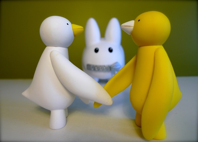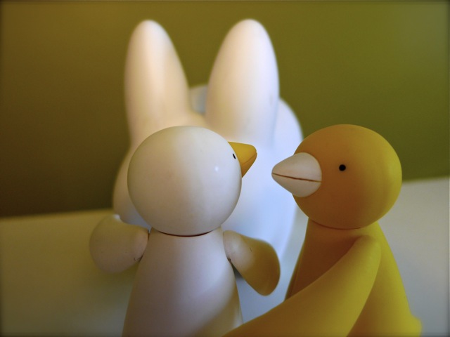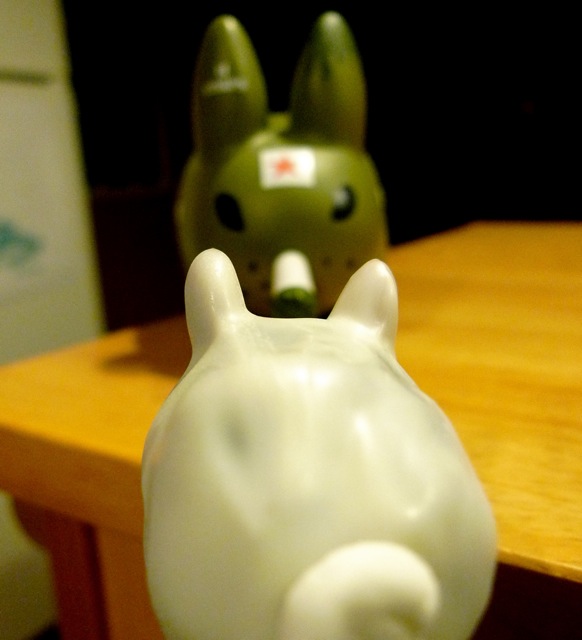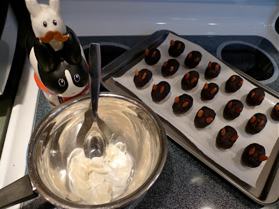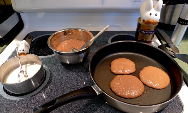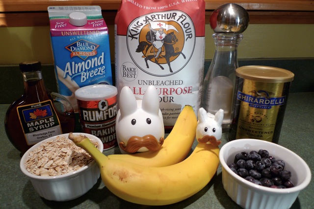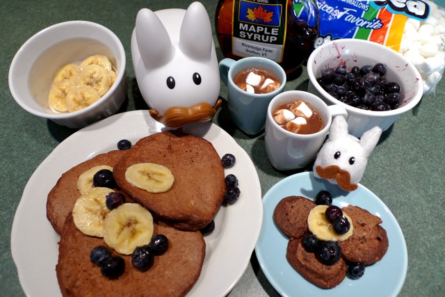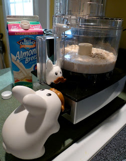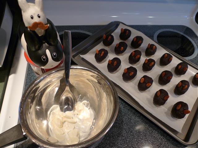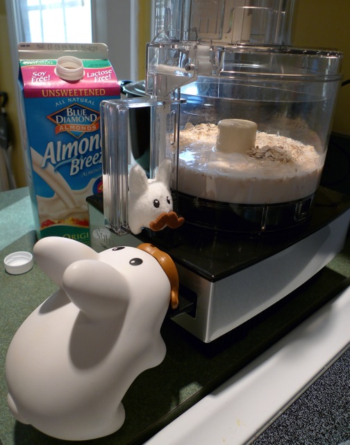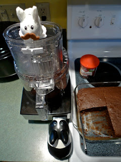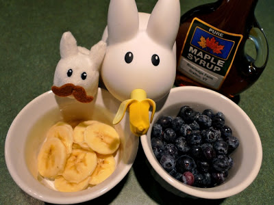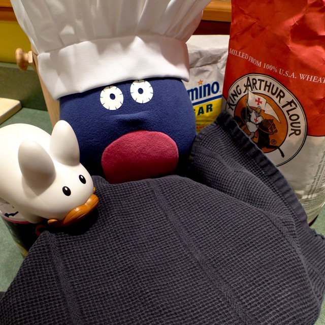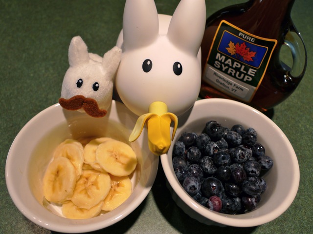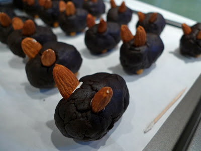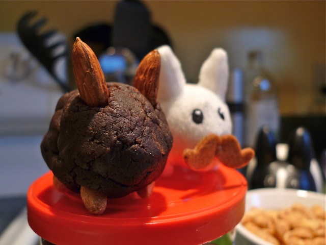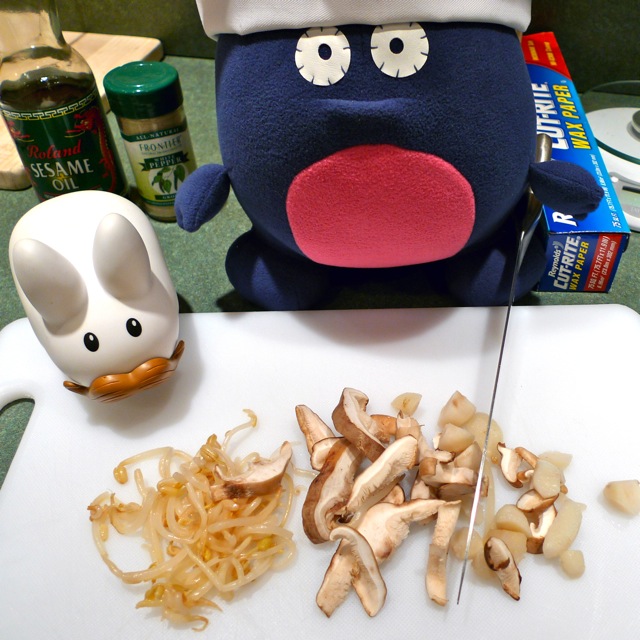 The labbits have faith that Chef Jimmy will come up with something delicious. For his first day at the warren, he made vegetarian dim sum bao, which is a steamed dumpling shaped bread, stuffed with a variety of fillings. One of the most popular bao is char siu bao, a bun filled with BBQ pork. Jimmy often ducks out of the Toronto Monster Factory headquarters and up Spadina Ave for a quick nibble of char siu bao. Knowing the labbits are vegetarian, he decided to raid the labbit pantry and put together a labbit version. He ended up using bean sprouts, shiitake mushrooms, water chestnuts and Lightlife Gimme Lean vegetable protein. It pan fries and crumbles just like ground meat. Then he threw in some soy sauce, hoisin sauce, white pepper, salt, and ginger, and stuffed the bao.