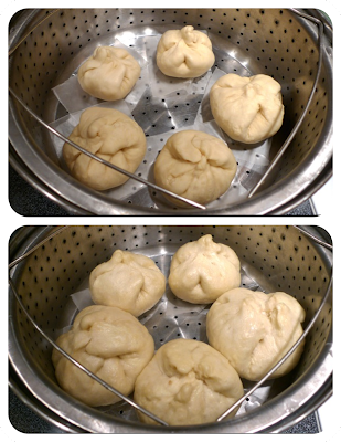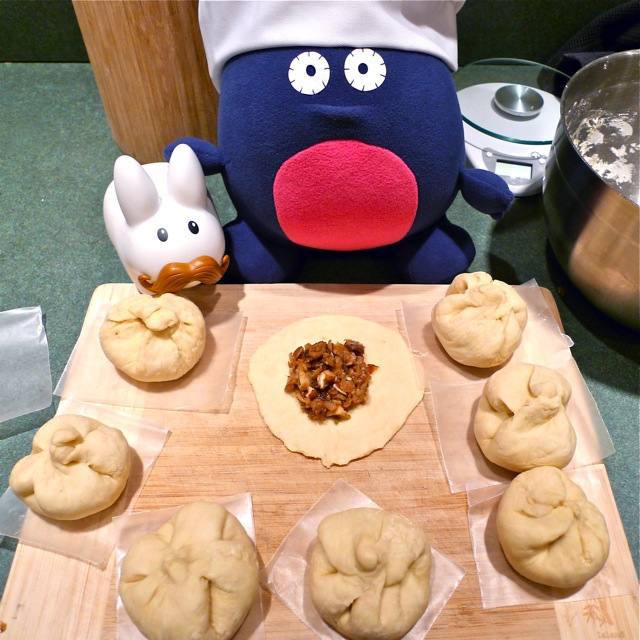 Note: No exact amounts for the filling were provided, but you can choose whatever savoury fillings you'd like. Just be sure that everything is finely chopped, and that you have about 1.5 to 2 cups of filling "stuff" for your 8 bao.