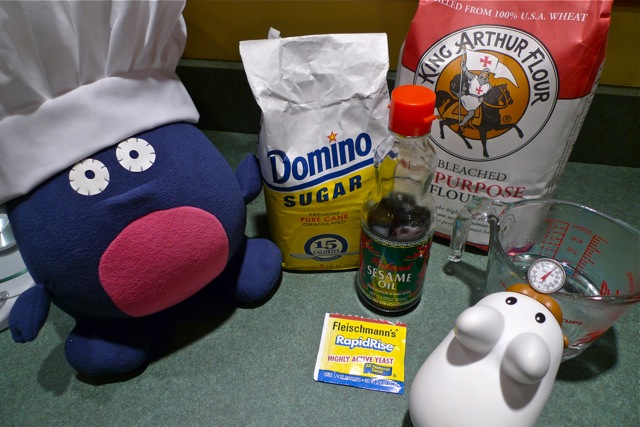 In a large bowl, dissolve yeast and sugar in warm water and allow to rest for 5 minutes. Add the flour and sesame oil. With clean hands, knead the dough until smooth, about 10 minutes. The dough will be very sticky! Add up to 4 more tablespoons of flour if needed.