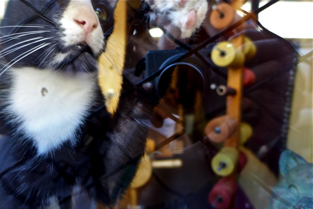 These two cats were shop cats inside Louisiana Loom Works, a custom hand-weaving rug workshop on Chartres St. What cat wouldn't love to live in a loom shop? Just think of all those cozy rugs and all those balls of thread! It's hard to believe the shop wasn't in ruins. What good kitties!