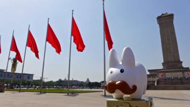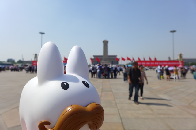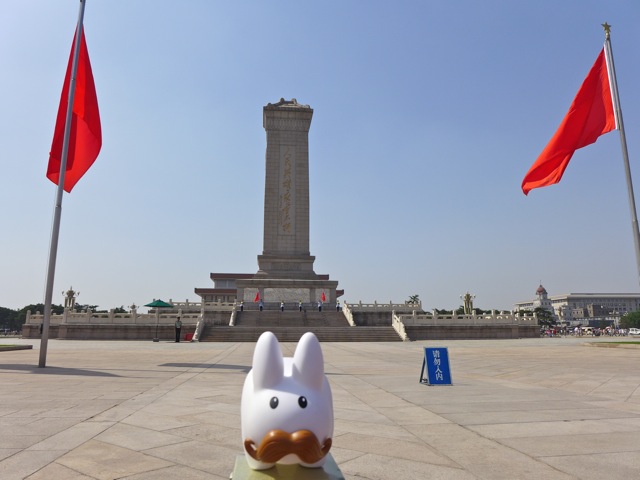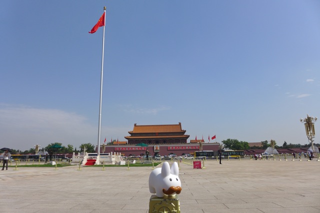 Pipkin's passport was scanned. Security checked to make sure he wasn't hiding anything in his mustache, and they went through his camera bag (this is standard security practice for visiting many tourist sites in Beijing). After he was cleared, Pipkin hopped through the gate and felt a chill as he took his first steps onto Tiananmen Square.
