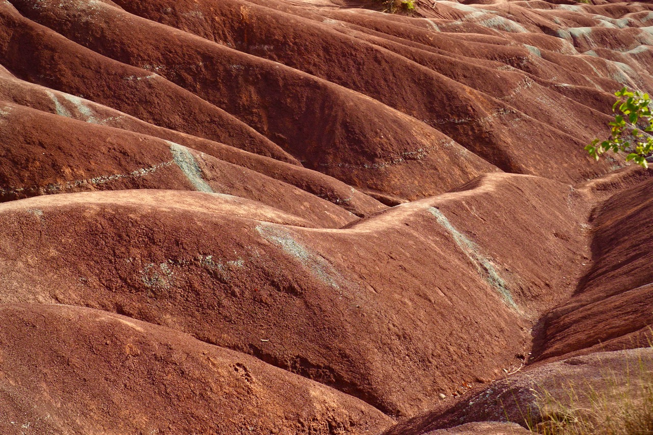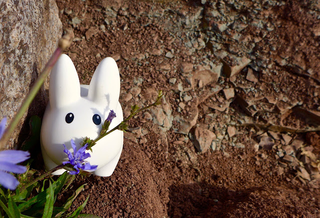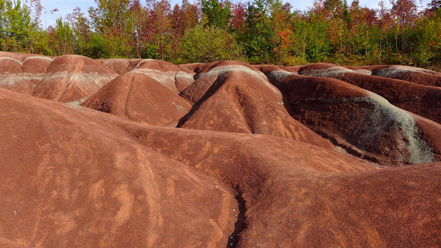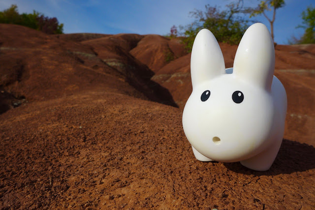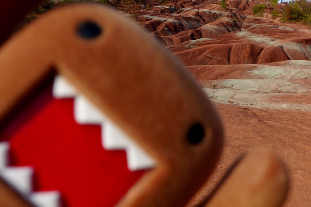 Pipkin and Domo are visiting a land formation known as badlands - dry terrain of soft rock and soil that has been exposed by erosion. This is the Cheltenham Badlands, located along the Niagara Escarpment and the Bruce Trail, in southern Ontario, Canada.