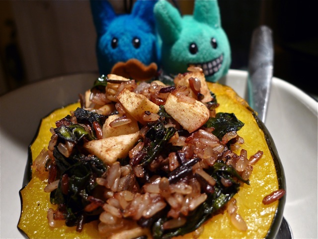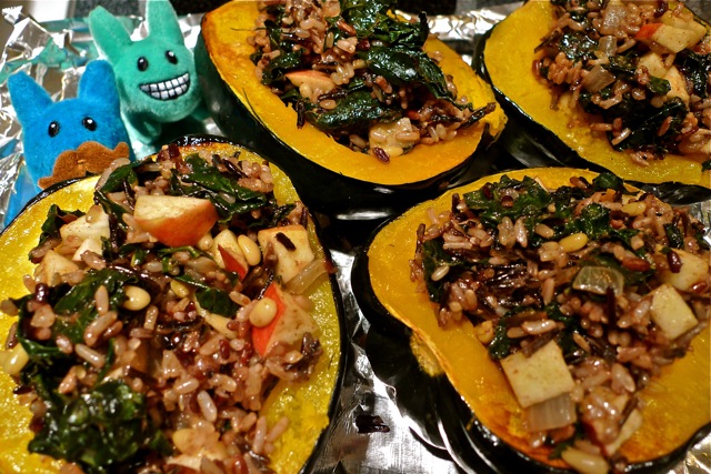 Acorn Squash Stuffed with Spiced Wild Rice, Kale, Apple and Pine Nuts