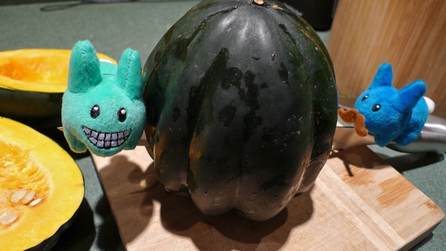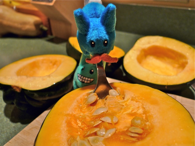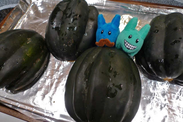A word of warning: As good as this stuff smells, make sure you don't stay in the oven while the squash is cooking. In fact, here's some helpful advice on how to care for your plush labbits, from labbit creator Frank Kozik: