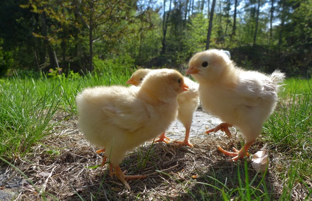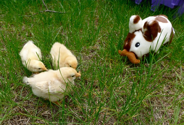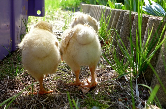 Baby chicks are easy to care for, even a cat can do it. (The warren's cat respects all animals and has no hunting urge. Don't worry, she never tried to attack the chicks.) For the most part, chicks need to stay in their brooder, but on a really nice, warm day, they can go outside, as long as they are supervised.