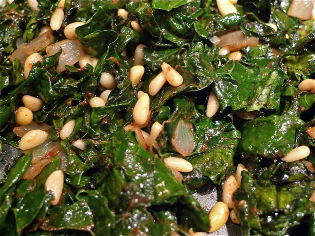 See? The kale cooked down. Mmm does that stuffing look good. Now, in a small bowl whisk together the last Tbsp of olive oil, red wine vinegar, balsamic vinegar and mustard. Stir in the chopped apple, pine nuts and cooked wild rice, and add it to the kale mixture. Mix to distribute evenly.