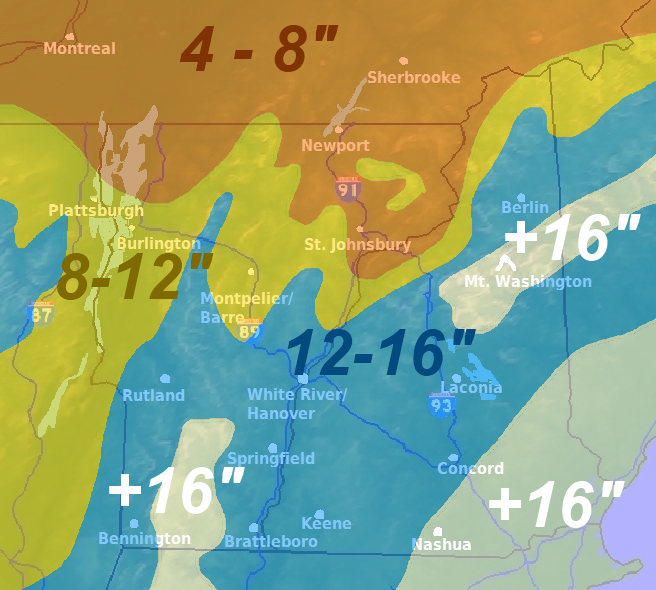 It's been a pretty disappointing winter in Vermont. Better than last year, but still not great. Warm spells here and there have melted away most of the snow, as you can see in these pictures. But there's a big Nor'easter headed for New England, and Bellows Falls is sitting in the 12" - 16" snowfall zone.