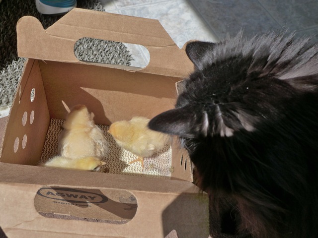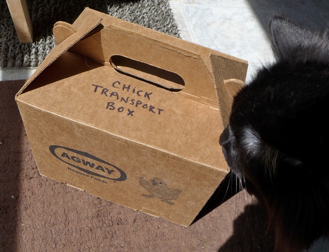 There was a loud knock on the door early the other morning. The house kitty went to the door but no one was there. Just this box, with high-pitched peeping noises inside.