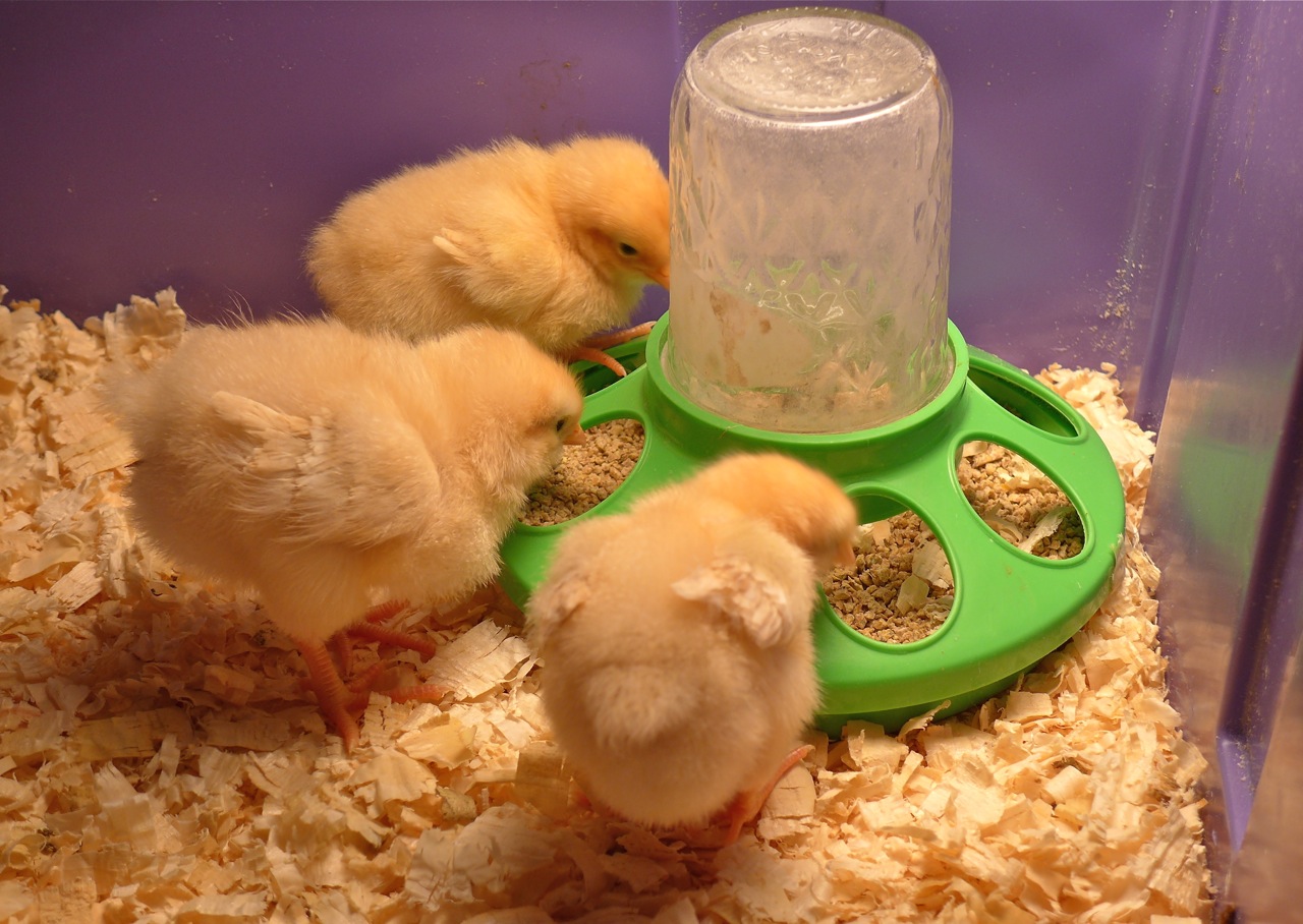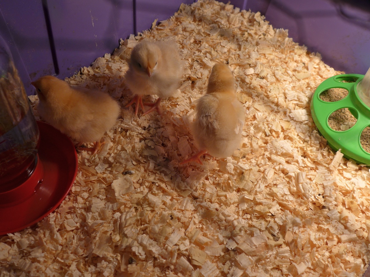 At the bottom of a large plastic bin which he purposed as a brooder, he laid down clean, fresh pine shavings for bedding. In one corner, he put chicken feed into a feeder, and into the other corner he would put in a waterer.